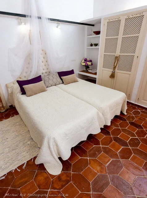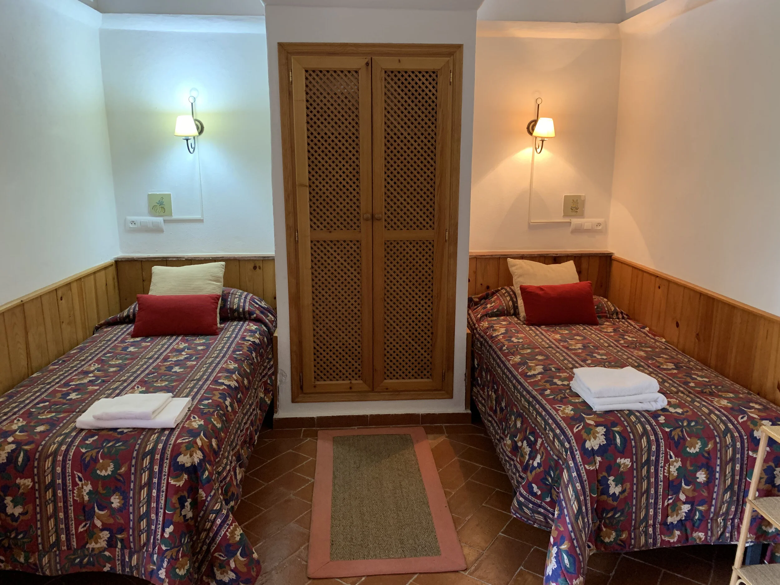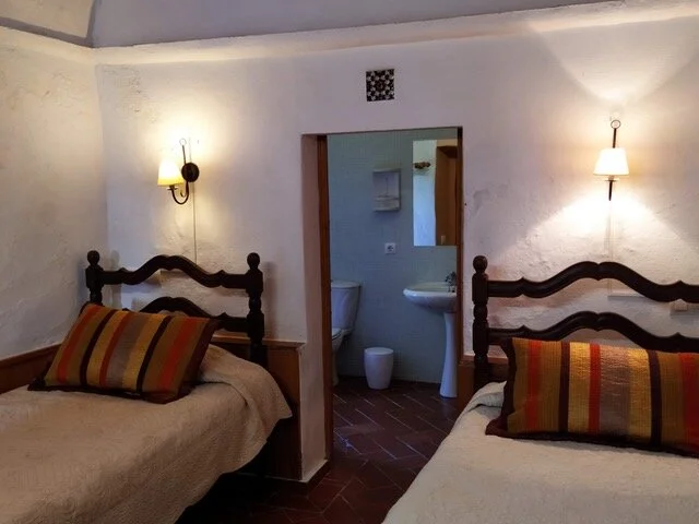 The rooms are converted cells built in 1416 by the Jeronimo order. Nowadays, they have a comfortable and charming feel, with lovely views towards the gardens, cloister or valley. The decoration is rustic shabby chic. The shower rooms have mosaics and incarved showers. Ideal for a romantic getaway for a couple and/or family outing or groups of 10-24 who wish to rent the whole guesthouse.